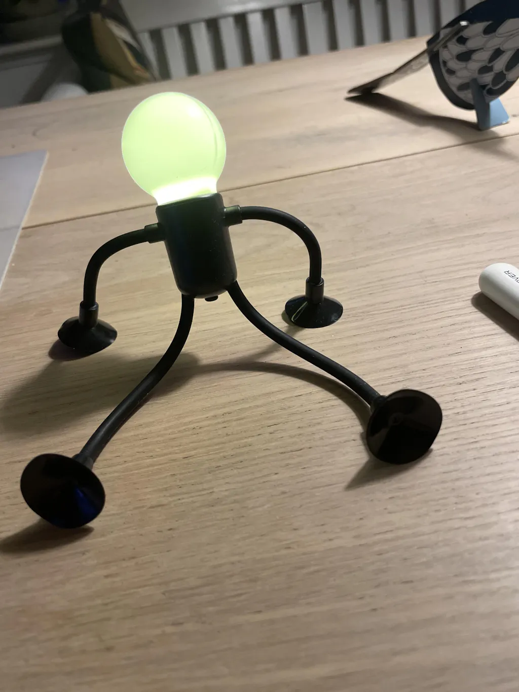 En lekfull lampa med personlighet. Flexibla armar och sugkoppsfötter låter den klättra, hänga eller stå precis där du vill. Varm, mjuk belysning möter kreativ design, vilket gör den till den perfekta lilla följeslagaren för ditt skrivbord, hylla eller nattduksbord.